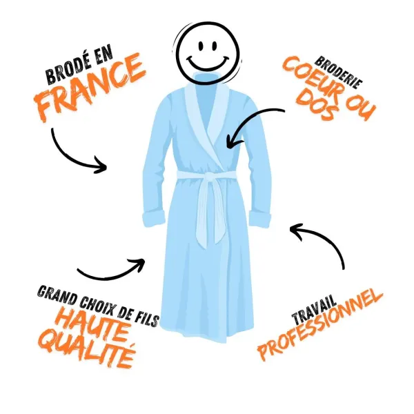 Chaque peignoir est brodé à la main, en France, avec un soin tout particulier apporté à la qualité du fil, à la densité des points et à l’harmonie des couleurs. Que vous choisissiez un prénom discret sur la poitrine, un mot doux dans le dos ou une petite phrase qui vous ressemble, la broderie apporte une touche unique et personnelle qui transforme ce vêtement en véritable pièce d’exception.