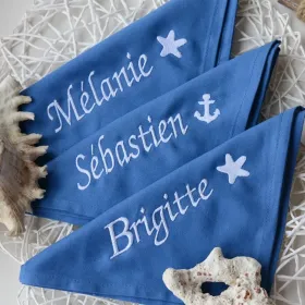 Les plus jolies serviettes de table en coton brodées et personnalisées avec le prénom d'un communiant. Une superbe idée de décoration de table pour le repas de communion. Travail de broderie réalisé en France